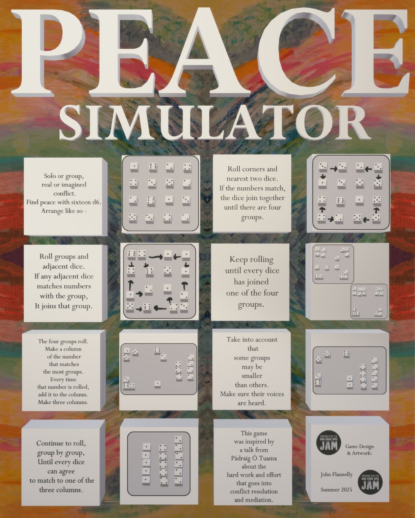 Peace Simulator is a one-page game inspired by the work that goes into conflict resolution and mediation. This game requires sixteen dice and an open heart.